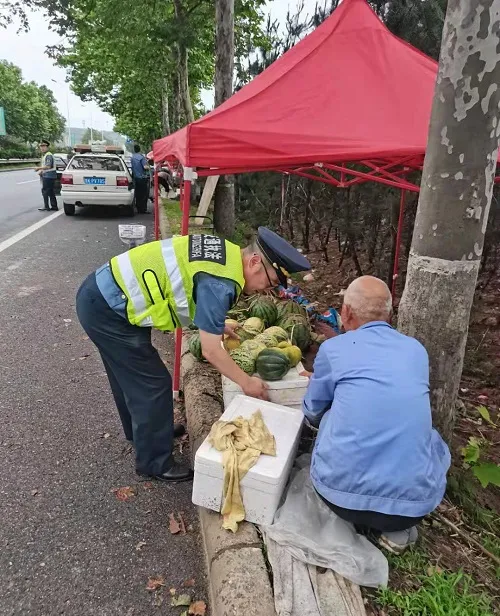 “大叔,不能在公路上及公路用地范围内摆摊,这里车速太快了,摆摊不仅影响路域环境和车辆通行,也给您自身带来了极大安全隐患,咱们有指定的售卖区域,可以把摊位搬到指定区域。”在S204初张路上,执法人员徐东欣、卢永建于清晨6点多来到现场,看到果农在公路上摆摊售卖西瓜劝导其将摊位挪到指定位置。