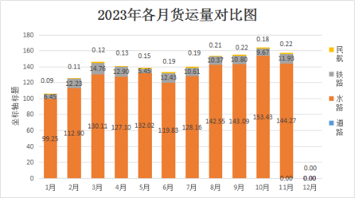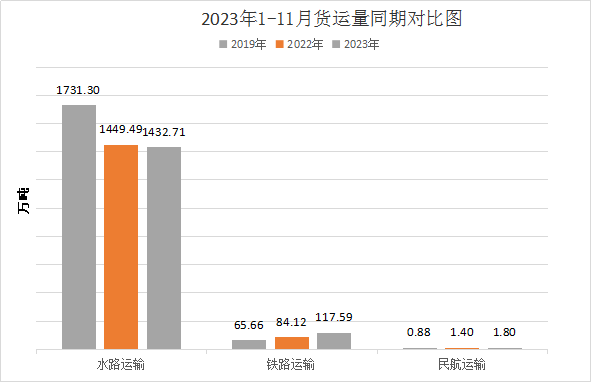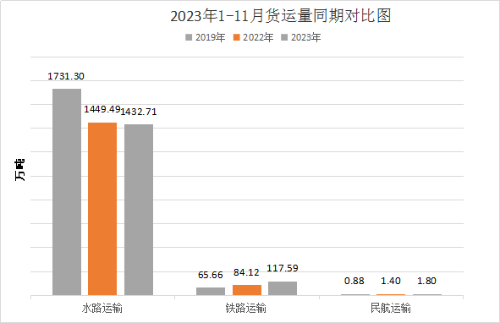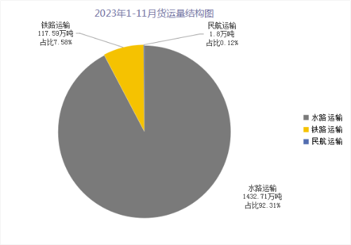 (二)货运方面。1-11月货运量同比增长1.11%,增速已由负增长转为正增长。由于道路运输货运量由省交通运输厅计算反馈,目前暂未反馈1-11月数据。所以1-11月货运量由铁路、民航、水路运输量组成。其中水路运输占比92.31%,所以水路运输货运量的增减决定了全市货运量的增速,下半年以来海大客运客滚船的货运量增长幅度大。