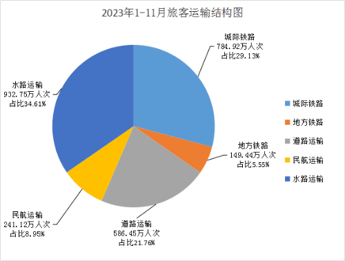 1.客运量。11月,全市完成客运量149.98万人次,同比增长140.19% ,比2019年降低15.62%,环比降低41.17%。其中,地方铁路客运量9.4万人次,占比6.21%,同比增长778.27%,比2019年降低58.64%,环比降低39.97%;城际铁路客运量42.3万人次,占比28.17%,同比增长244.34%,比2019年增长16.68%,环比降低41.99%;民航运输旅客吞吐量16.75万人次,占比11.17%,同比增长256.38%,比2019年降低27.17%,环比减少27.96%;水路运输客运量18.4万人次,占比12.24%,同比增长1047.5%,比2019年降低28.28%,环比降低74.96%;道路运输客运量63.22万人次,占比42.15%,同比增长47.71%,比2019年降低9.96%,环比降低9.51%。