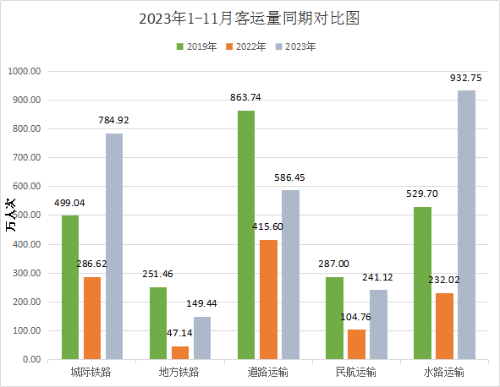 (一)客运方面。1-11月份客运量同比增长148.1%,比2019年增长10.85%。一是因去年同期受疫情管控影响,尤其是去年3、4月封控,封控期间客运数据几乎为0,导致去年同期数据较低;二是随着温度升高,群众出游需求增加,并且我市旅游资源丰富,是热门旅游目的地之一。三是道路运输增速与全市增速差距较大,对全市总体客运量恢复速度造成一定影响。主要因为随着高铁网络的逐步完善、以及对高铁开行车次的不断优化,乘坐高铁出行更加便捷高效,从而降低了对长途客车的选择。