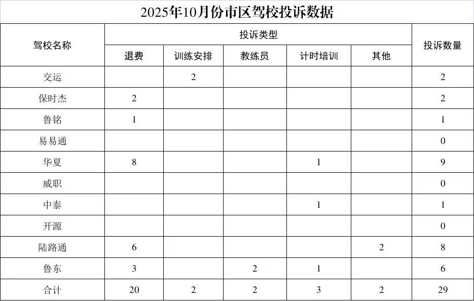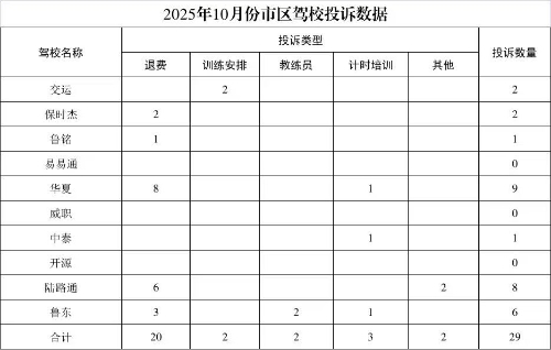 近日,交通运输部门整理了2025年10月份市区驾培机构投诉数据。经统计,2025年10月份,市区驾培机构共受理投诉29起,单月投诉量下降50%。从投诉分布情况看,易易通、威职、开源驾校本月实现“零投诉”,华夏、陆路通驾校投诉量分别占总投诉量的31%、28%。从问题种类看,各驾校退费问题占总投诉量的69%。