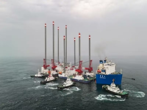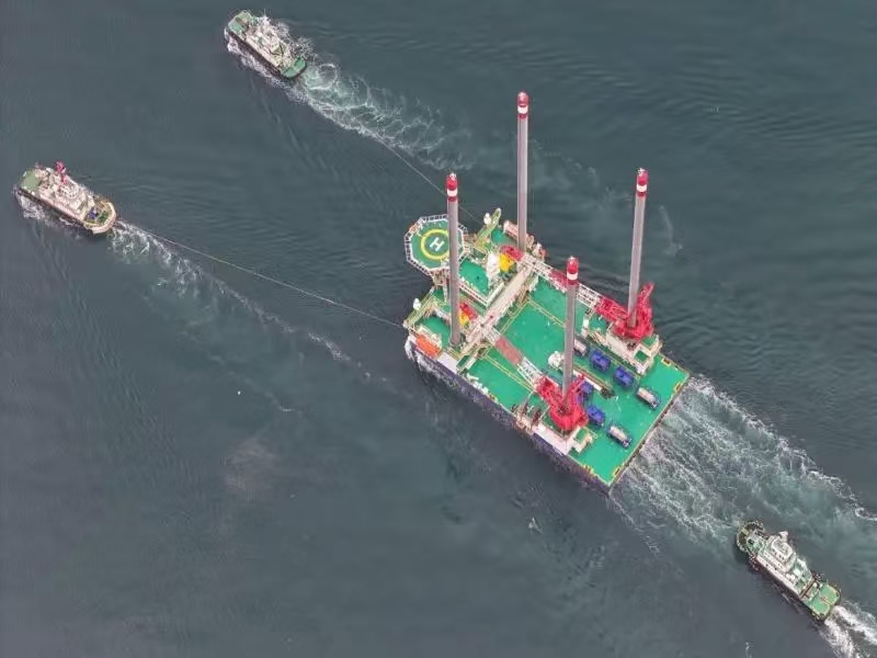 经专业研判,以往此类海工装备运输常用的横装方式,可能影响装载稳定性。应货主要求,威海港引航站首次将“T”型(一横一纵)装船法应用于实际作业。针对新工艺带来的多种挑战,威海港引航站由业务副站长周其伟牵头成立专项工作组,针对平台出厂时大角度转向、拖航中航向稳定性差以及装船期间近距操作的高风险难题,创新性地采用“多拖轮协同作业+定点气象预报+航道智能监管”的综合措施,指挥4艘大马力拖轮以“首尾相顾、飞翼阵列”的布控,采用“先纵后横”的方式精准把控入船角度,最终实现厘米级定位精度,安全将两艘平台装载至预定位置。