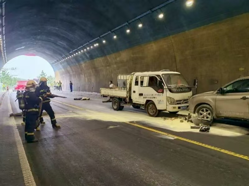 演练模拟双向两车道马石店隧道内发生一起货车与小轿车碰撞事故,导致小客车油箱破损引发火灾,产生大量浓烟,造成3名人员被困(其中1人“重伤”),隧道内交通中断,火势有向相邻车辆蔓延趋势。