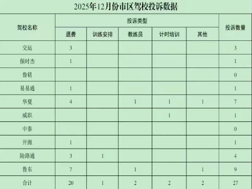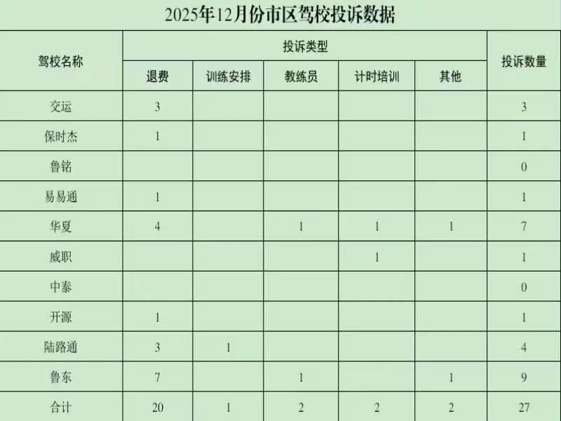 近日,交通运输部门整理了2025年12月份市区驾培机构投诉数据。经统计,2025年12月份,市区驾培机构共受理投诉27起,单月投诉量下降29%。从投诉分布情况看,中泰、鲁铭驾校本月实现“零投诉”,鲁东、华夏驾校投诉量分别占总投诉量的33%、26%。从问题种类看,各驾校退费问题占总投诉量的74%。
