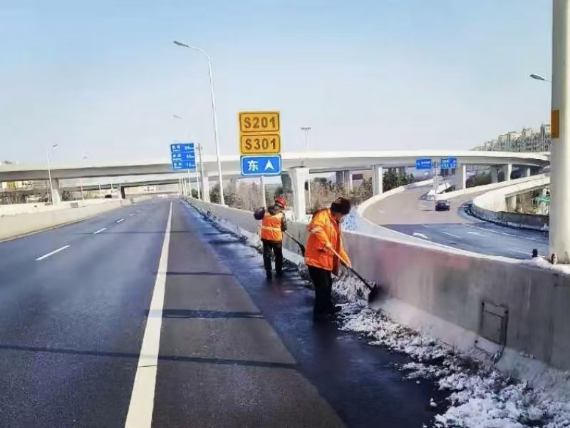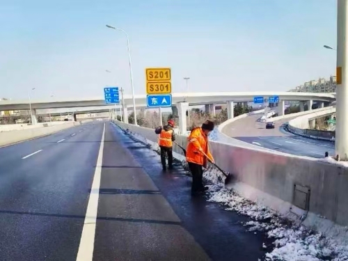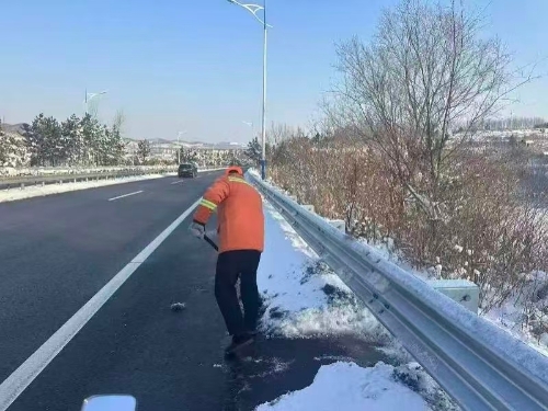 全面排查雪后出现的路面病害,及时使用冷补料修补路面坑槽,确保通行安全,对损坏的安防设施损坏进行维修,并全面清理泄水槽、排水孔等排水设施积雪,确保功能良好。