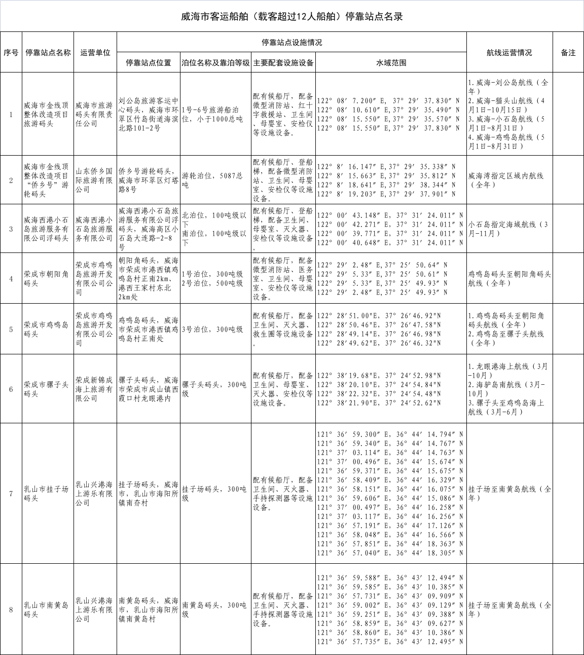 威海市客运船舶(载客超过12人船舶)停靠站点名录