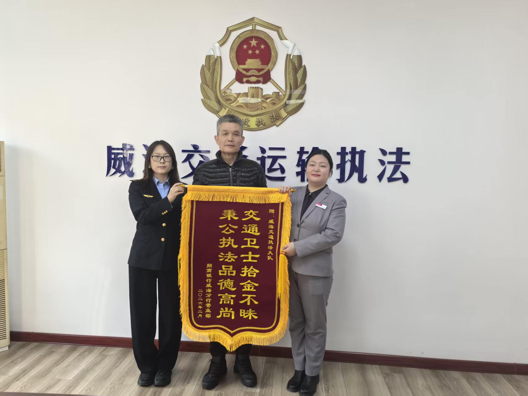 近日,招商银行威海分行营业部专程将一面印有赞誉字样的锦旗送到市交通运输综合执法支队,对支队退休干部刘义官同志拾金不昧的高尚品德致以诚挚感谢。