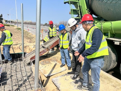 本次检查覆盖工程全线,共涉及1家监理单位和7家施工单位,实现对参建各方的全面督查。检查重点聚焦主要管理人员的合同履约及在岗履职情况,以及施工现场各项质量安全措施的具体落实情况。在作业区,检查组深入工序细节,紧盯标志基础开挖、护栏安装、标线施划、彩色陶瓷颗粒铺装等关键环节,逐项核验护栏的安装位置与牢固程度,细致查看彩色陶瓷颗粒铺装的施工工艺,并对底座混凝土浇筑及养护环节进行查验。与此同时,检查组还对作业区安全警示标志规范布设、交通组织方案执行情况进行了现场核查,并对试验管理、材料存放、养生试块养护等环节逐一“过筛”,确保每一处细节符合规范要求。